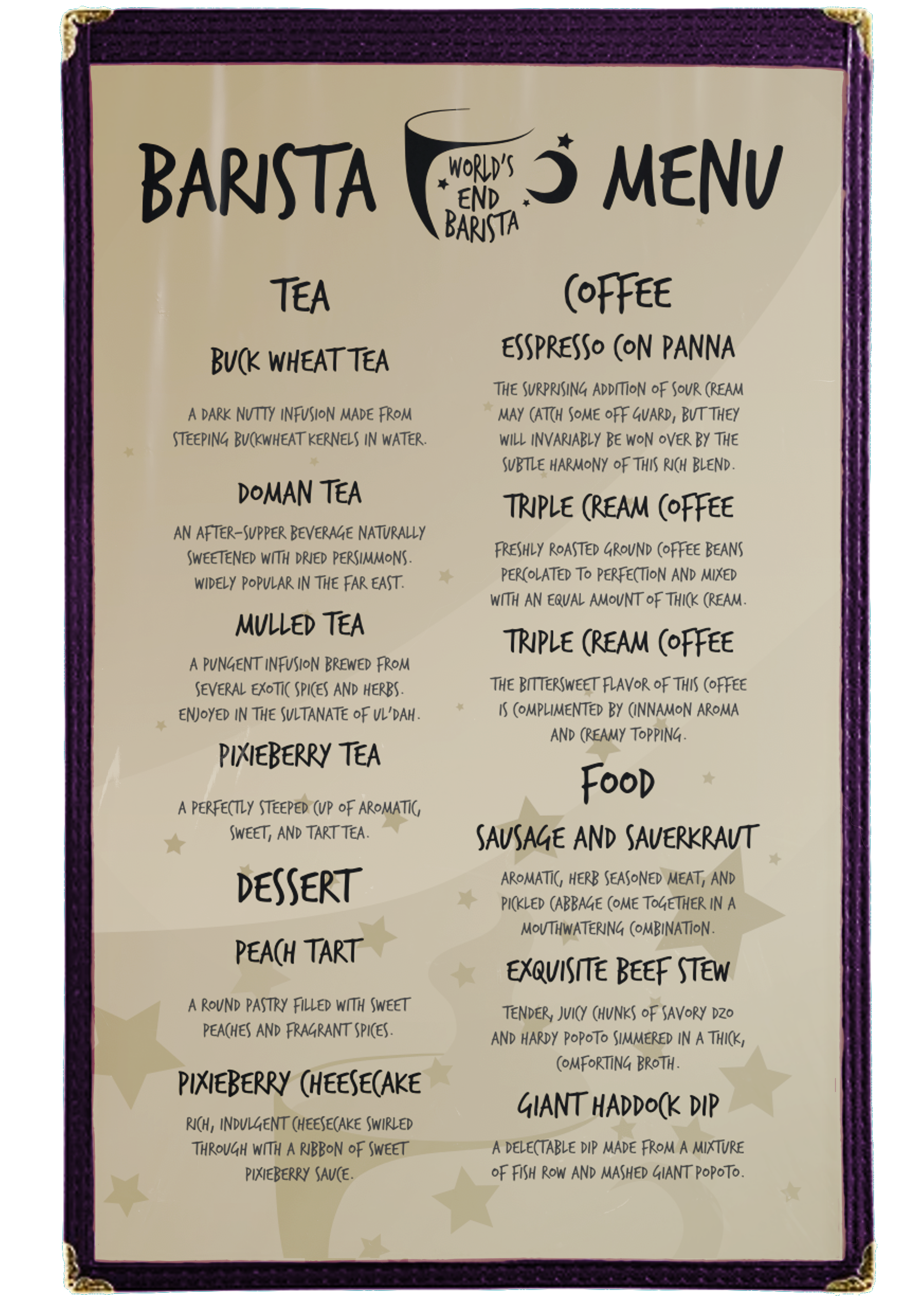 A brief respite at the edge of eternity, the brand focuses on the themes of night and space. Despite the ominous name of the barista it is meant to be a space where individuals can forget their woes and relax with a cup of coffee.